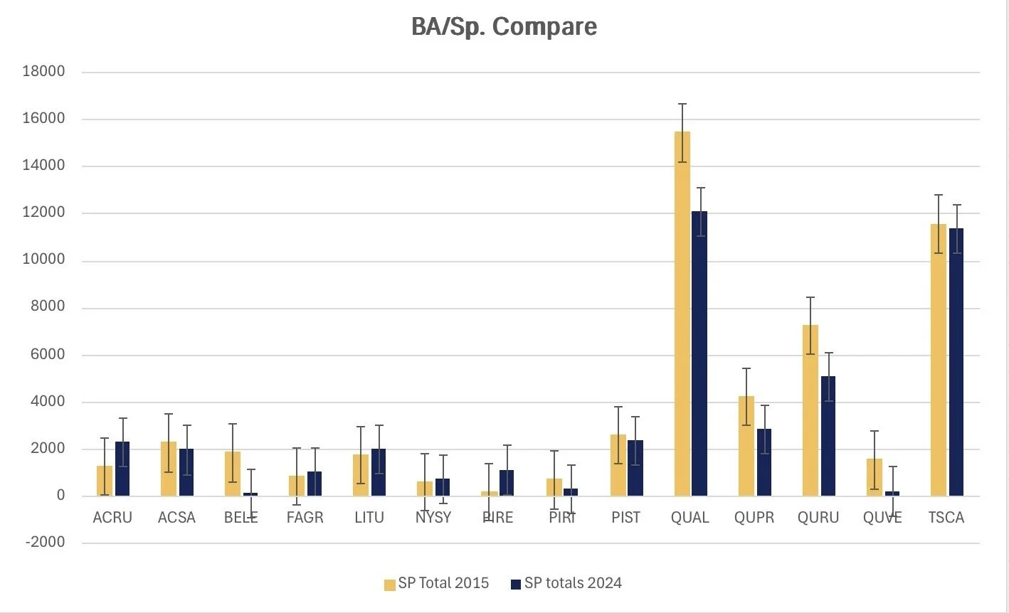 Basal area growth of the dominant tree species between 2015 and 2024.